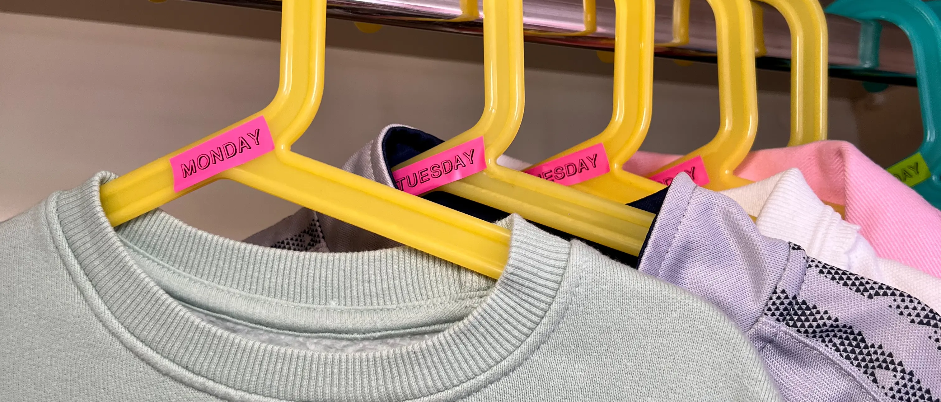 Pour mettre fin au chaos des matins chargés et s'assurer qu'ils se déroulent sans encombre, Hazel a utilisé la PT-N10 de Brother, une étiqueteuse personnalisée, pour étiqueter et organiser les tenues de ses enfants par jour. Les étiquettes à code couleur identifient clairement chaque tenue, ce qui permet aux enfants de s'habiller plus rapidement et plus facilement, avec moins de stress.